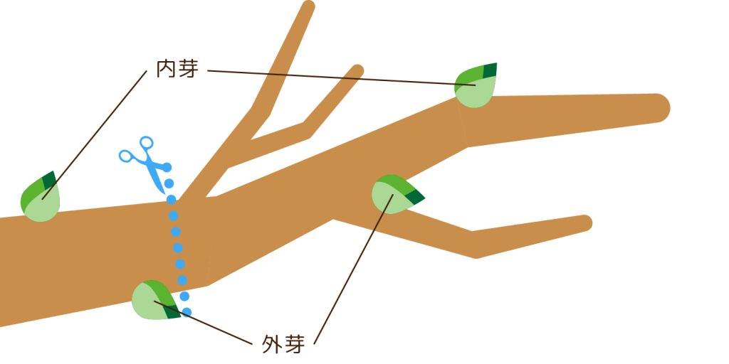 高さを抑えるために、根元に近い部分で剪定内側に向かって伸びた枝(内向枝)は整理する枯れた枝(枯れ枝)は病害の原因になるため除去風通しを良くし、木全体のバランスを整える