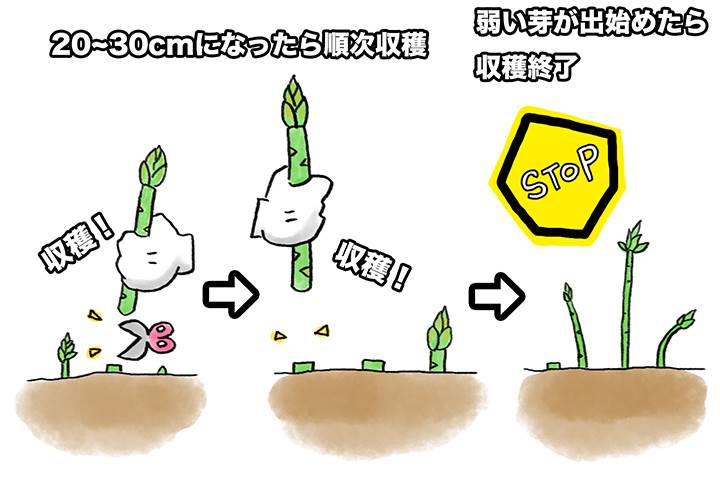 アスパラガスの収穫は、 芽が25〜30cmになったら!収穫のタイミングが遅れると 筋が硬くなり、食感が悪くなる ので注意⚠️