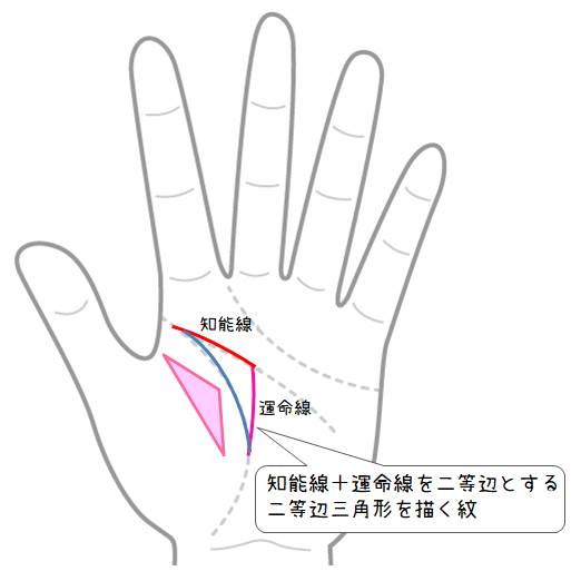 美禄紋とは、相談者の話によると、知能線と運命線が二等辺となり、生命線が下のラインとなる二等辺三角形の形になる紋のことらしい。