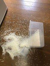 写真を見ると、ご飯が鍋の縁から溢れ、床にまで広がっています。このような状況では、床に付いたご飯と床に付かないご飯を迅速に分けることが重要です。床に直接付いたご飯は衛生的に問題があるため、特に注意が必要です。