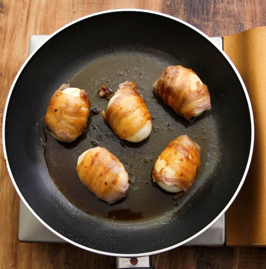 焼く フライパンにサラダ油を入れて中火で熱し、豚バラ肉を巻いた卵を入れて焼きます。両面にこんがりと焼き色がつくまで焼きます(約5分)。