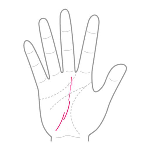一本線でしっかり太い線で伸びている人は少なく、切れ切れで伸びている場合が多いのが、月丘から伸びる運命線の特徴です。