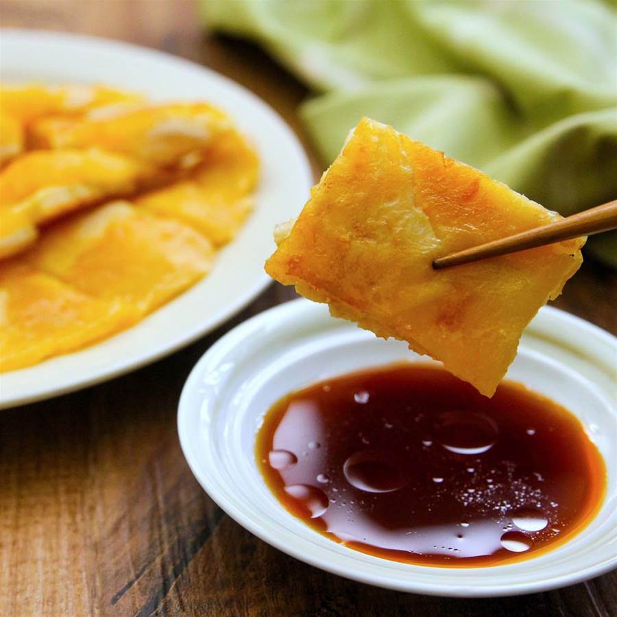 ① 焼き上がったチヂミを食べやすい大きさに切り、お皿に盛る。