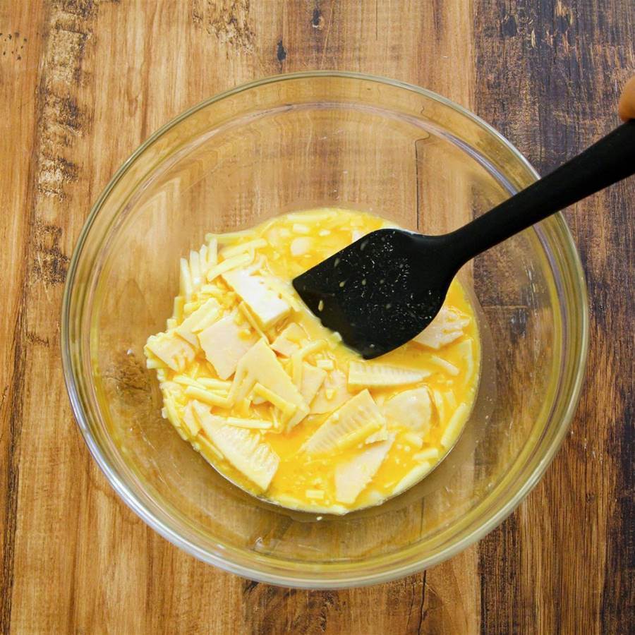 ③ 薄切りにしたたけのこ&チーズ を加え、全体をさっくり混ぜ合わせる。