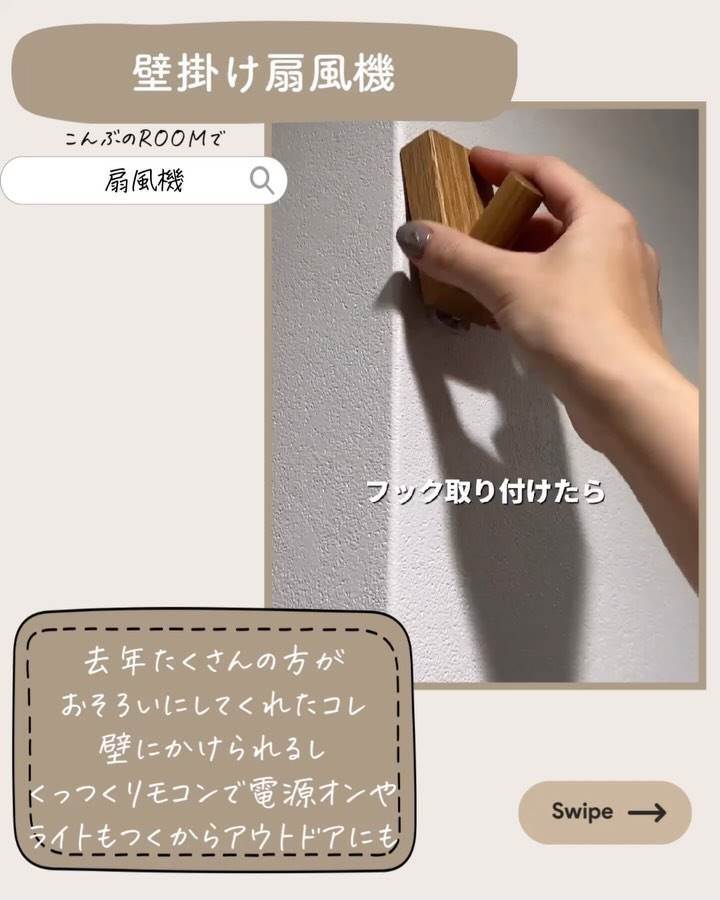 「壁掛け扇風機」は、省スペースで設置でき、リモコン操作で簡単に電源オンオフが可能。ライトもつくので、アウトドアでも使えます。フック取り付け後、どこにでも設置できるので、部屋のレイアウトに悩むこともありません。