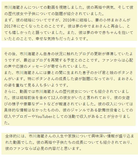 市川海蔵さんは2010年に結婚し、妻の小林まおさんが2017年に亡くなったというニュースが大きな話題となりました。再婚後、市川海蔵さんは夢の中で亡くなった妻と再会する夢を見るなど、彼女との思い出を大切にしていることが分かります。また、市川海蔵さんは歴代の彼女が数人いることでも知られており、その中には有名女優やモデルも含まれています。