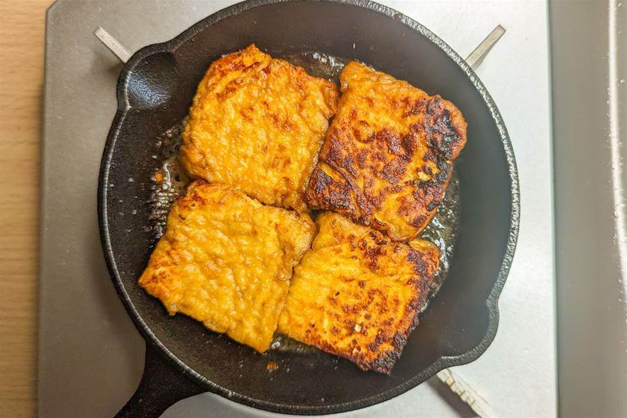 フライパンにバターを引き、中火で熱します。バターが溶けたら、厚揚げを並べて両面をしっかり焼きます。焼き色がついたら、次のステップへ。