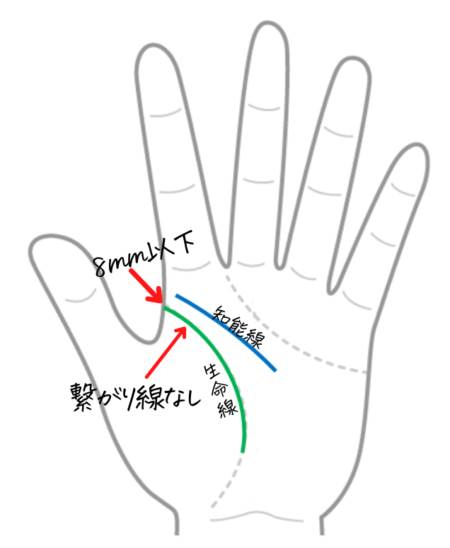 まず、離れ型とは何かを説明しましょう。一般的に、知能線と生命線の起点がくっついている人が多いのですが、この二つの線が離れて始まっている場合、それを「離れ型」と呼びます。離れ型の人は、AB型の人と同じくらいの割合で存在すると言われています。
