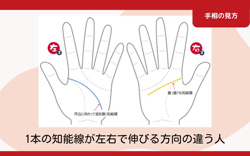 手相は、その人の思考パターンや才能、そして未来の可能性を映し出す羅針盤のようなものです。中でも、知能線は、その人の知性や思考傾向を示す重要な線として知られています。パナセ流手相術では、左右の手の知能線の伸びる方向が異なる場合、その人は特別な才能を持っていると考えます。特に、「右手が真っ直ぐ横に伸びる知能線で、左手は月丘に向かって伸びる知能線を持つ人」は、「二足のわらじを履くと良いタイプ」とされ、仕事とライフワークの両立によって、人生をより豊かにできる可能性を秘めているのです。