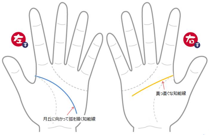 次に、左手の知能線を見てみましょう。月丘に向かって伸びる知能線の人は、ロマンチックな空想家タイプです。本を読んだり、空想にふけったりと、一人遊びが得意で、一人の時間を必要とします。現実的な右手と、ロマンチックな左手。この相反する二つの性質が、この相を持つ人の魅力を形作っているのです。