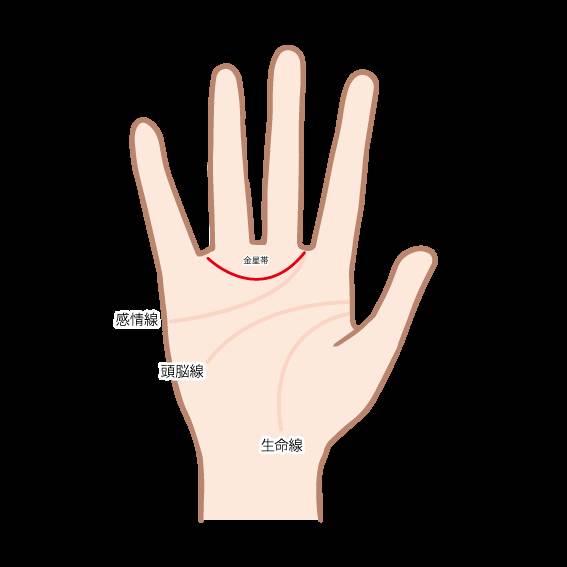 人差し指と中指の間から薬指と小指の間にかけて、弧を描くように伸びる「金星帯(モテ線)」。この線を持つあなたは、異性を惹きつける天性の魅力の持ち主です。まるで磁石のように、自然と人が集まってくるでしょう。