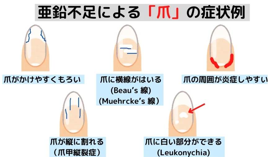 爪に横線や凹みが現れることがあります。これは亜鉛が不足しているサインです。亜鉛は細胞の分裂や成長に欠かせない栄養素で、特に爪や髪の毛の健康に大きな影響を与えます。亜鉛が不足すると、爪が薄くなり、割れやすくなるだけでなく、傷の治りが遅くなったり、味覚障害が起こることもあります。