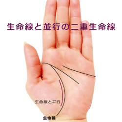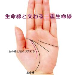 このタイプの二重生命線は、比較的一般的に見られます。生命線と並行して、起点が離れて出る線です。この線がしっかりとしたものなら、生命力が強く、体力や気力が非常に充実している証拠です。特に、二重生命線が重なる期間は、運勢が安定し、充実した生活を送ることができる時期であることが多いです。