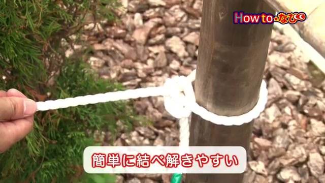 まずロープの端を柱に一周巻きつけ、できた輪の中にロープを通す。それをもう一度繰り返すと、自然と結び目ができる。