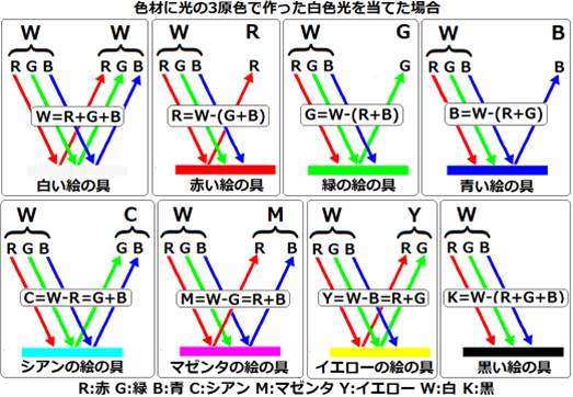 例えば、黄色(青を吸収)とシアン(赤を吸収)を混ぜると、残るのは緑の光。だから混色すると緑になります。同じように、シアンとマゼンタを混ぜると青に、マゼンタと黄色を混ぜると赤に見える。すべてが理屈で説明できるのです。
