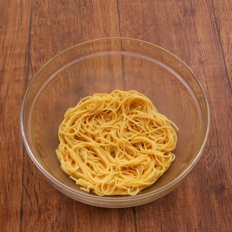 パスタの準備 耐熱ボウルに半分に折ったパスタを入れます。水200ml、鶏ガラスープの素、おろしニンニクを加え、軽く混ぜます。