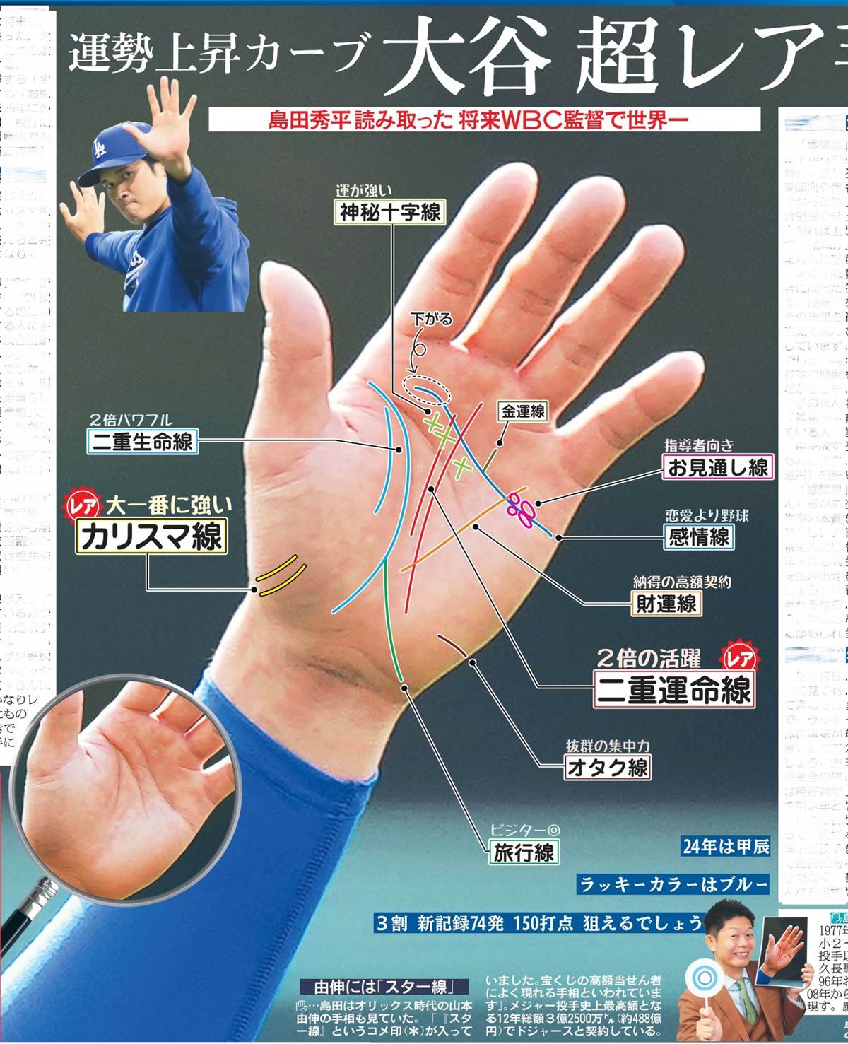 奇跡を信じる力手相の線一本一本には、大きな意味が込められている。しかし、それを最大限に生かすのは、大谷自身の努力と信念であることは間違いない。手相が未来を示すものであっても、彼がその運命を自らの手で掴んだことは言うまでもない。手相に現れた「奇跡を起こす特徴」は、彼が今後も新たな奇跡を生み出し続けることを予感させる。