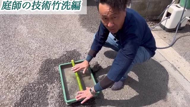 指を使って細かい汚れを取るモミ柄で洗う際に、表面に白い汚れや黒いカビのようなものがついていることがあります。この汚れは、指で軽く押し込みながら取ると、比較的簡単に落ちます。特に、竹の節の部分は硬いので、そこは少し回しながら強めに洗っていきます。