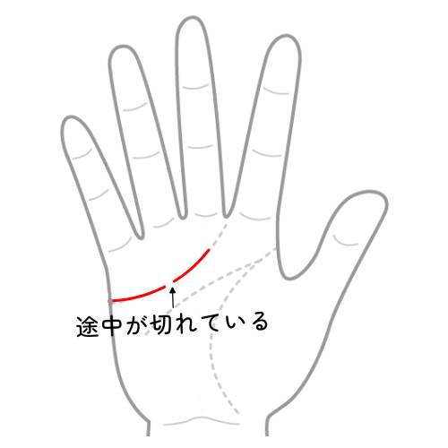 感情線が途中で「ブチッ」と切れている場合、それは愛情に対する警告を意味します。現在、愛情関係がもつれていたり、トラブルを抱えている状態でしょうか?あるいは、これからトラブルが起こる可能性を暗示しているのかもしれません。