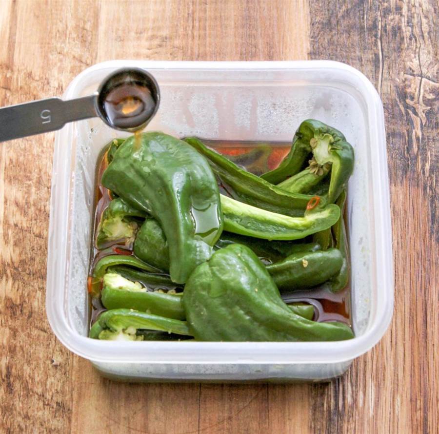 切ったピーマンを耐熱容器に並べ、水(120ml)、3倍濃縮麺つゆ(大さじ3)、おろし生姜(小さじ1/2)を加えます。おろし生姜がアクセントになり、ピーマンの風味を引き立てます。