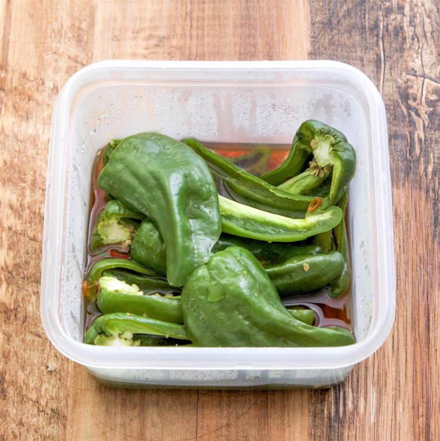 容器にラップをふんわりとかけ、600Wのレンジで約6分半加熱します。ピーマンがしんなりして、味が染み込んだら取り出します。