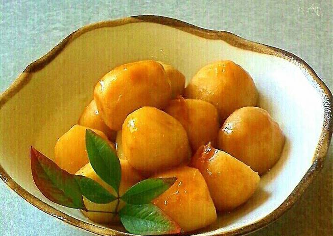 では、いよいよ江戸時代の代表的な居酒屋メニューを実際に作ってみます。まずは「煮っ転がし」。これは、里芋や大根を醤油と味醂で甘辛く煮た家庭料理で、庶民に広く愛されていました。里芋の皮を丁寧に剥き、鰹節からだしを取った後、醤油と味醂で煮込むだけというシンプルな料理です。煮込んでいくうちに、甘くて香ばしい香りが広がり、食欲をそそります。