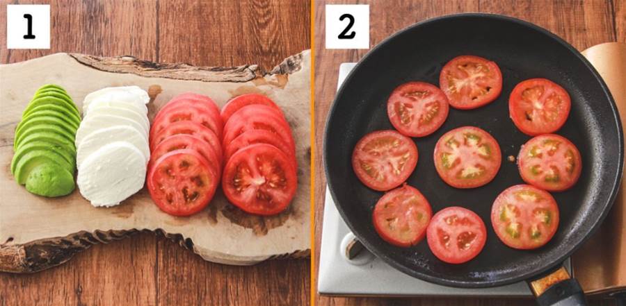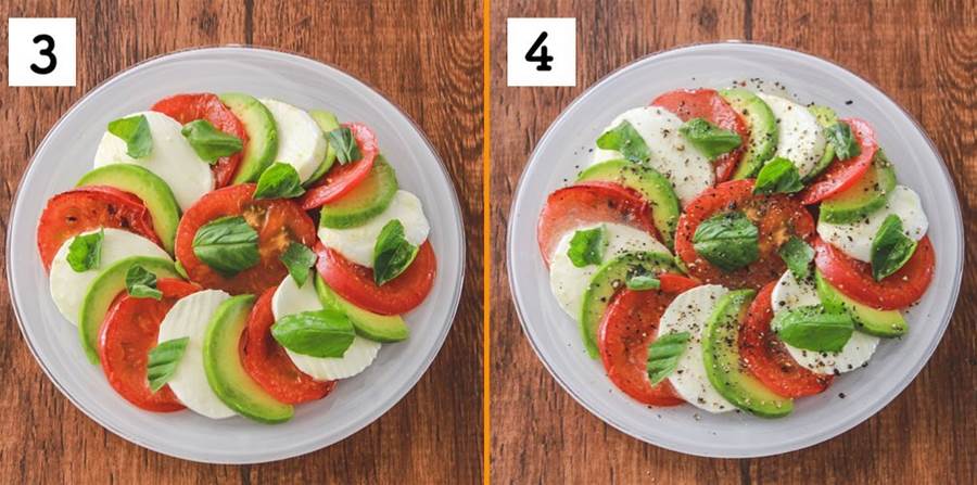 焼いたトマト、アボカド、モッツァレラチーズを交互に並べながら皿に盛り付けます。美しく並べることで、見た目にも食欲をそそる仕上がりに。