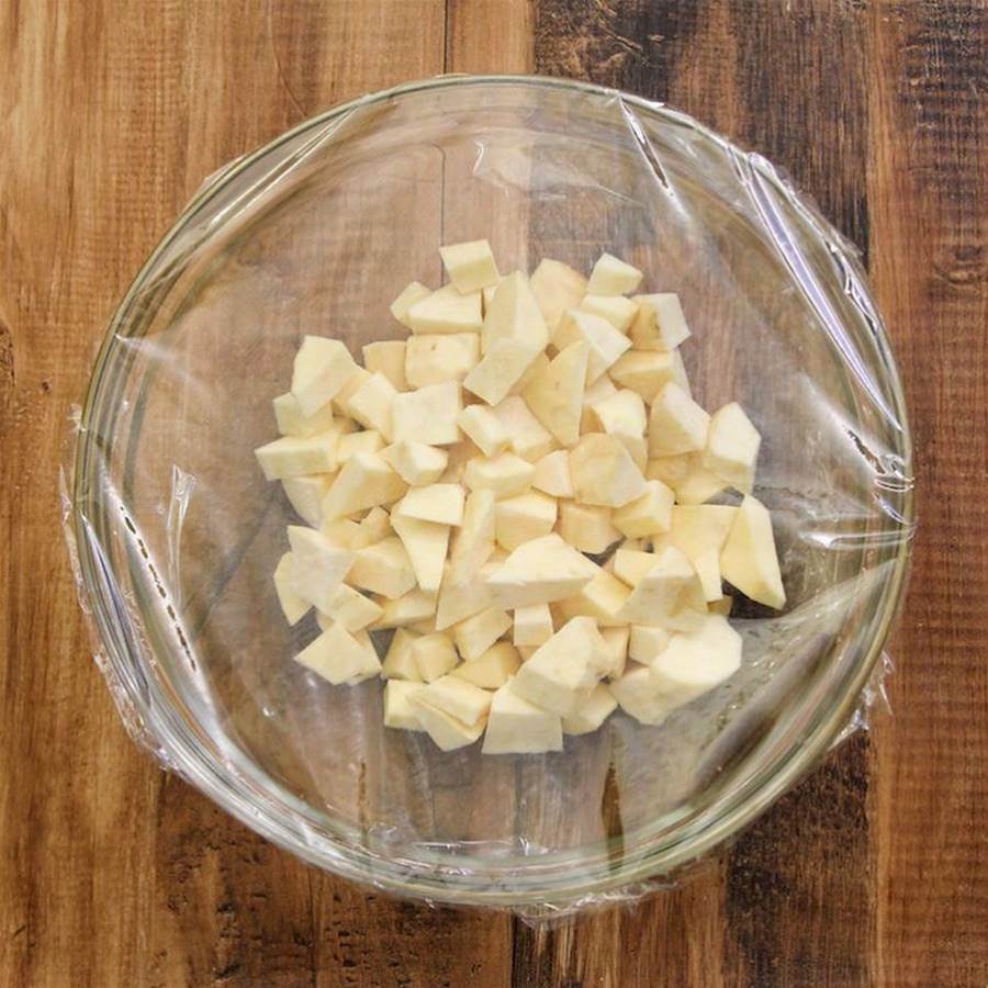 ① さつまいもは 皮をむき、小さくカット して耐熱ボウルに入れる。