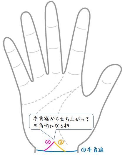 最も一般的な土台線は、手首線を底辺とし、月丘側と生命線側から二辺が伸びて、山なりに三角形を形成するものです。この相を持つ人は、家柄、家庭環境、受けた教育など、生まれながらにして人生の土台がしっかりと築かれていることを示します。