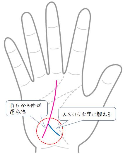 2つ目の土台線は、月丘から伸びる運命線(主に若い時期の流年)に、生命線側から影響線が入り、漢字の「人」の字のように見える相です。この相は、若い頃に人生の土台となるような努力を重ねた人に現れやすいとされています。