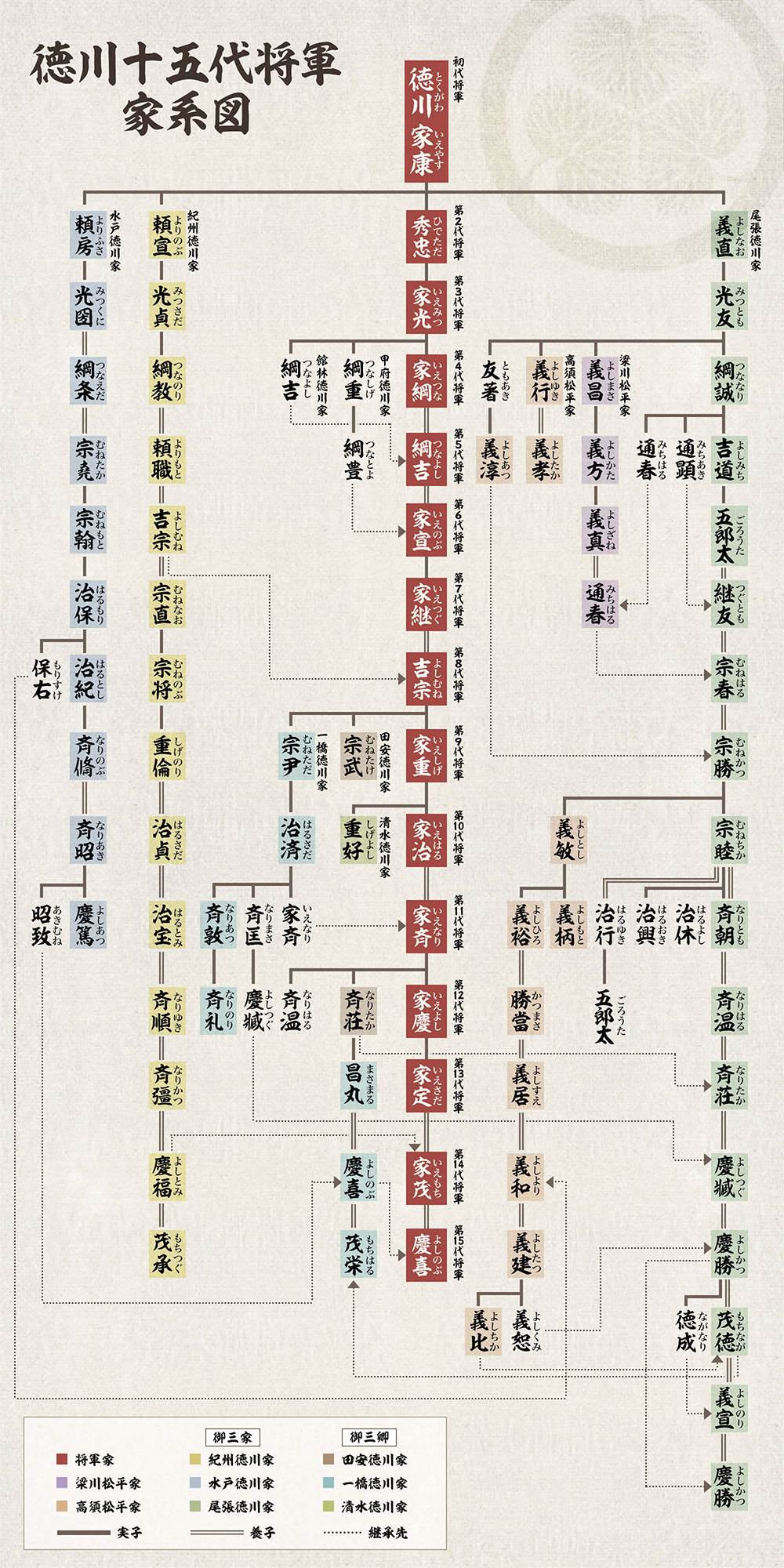 徳川家の家系図を見ると、将軍家、御三家、そしてその他の分家がどのように関係しているかが一目瞭然です。家康の直系は短命に終わりましたが、御三家を中心とした家系は幕府の安定と繁栄を支えました。