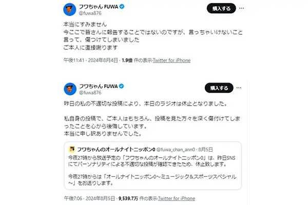 騒動が勃発したのは2023年8月。フワちゃんがX(旧Twitter)で、タレントのやす子さんに「死んでください」と暴言を投稿し、大炎上しました。フワちゃんはその後、投稿が誤操作であったと説明し、謝罪しましたが、この騒動の裏で加納さんの関与が噂されることになります。フワちゃんが暴言を投稿したのは、加納さんと他の芸人仲間と一緒に旅行中だったといいます。関係者の証言によれば、加納さんが最初にやす子さんの投稿を見つけ、「この投稿どうなん?」とフワちゃんに振ったことで、彼女が暴言を作成するきっかけになったとのことです。