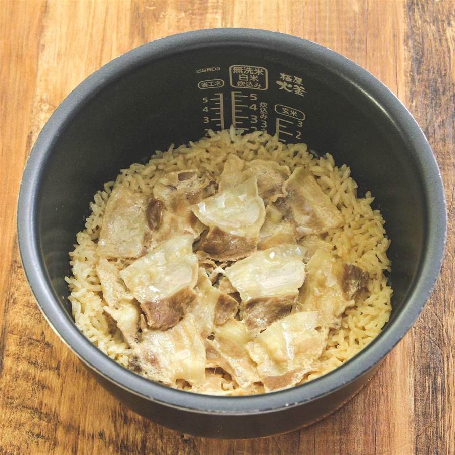 豚バラをのせて炊飯 調味料を加えた米の上に、豚バラ肉を均等に広げてのせます。炊飯器の通常モードで炊飯開始します。