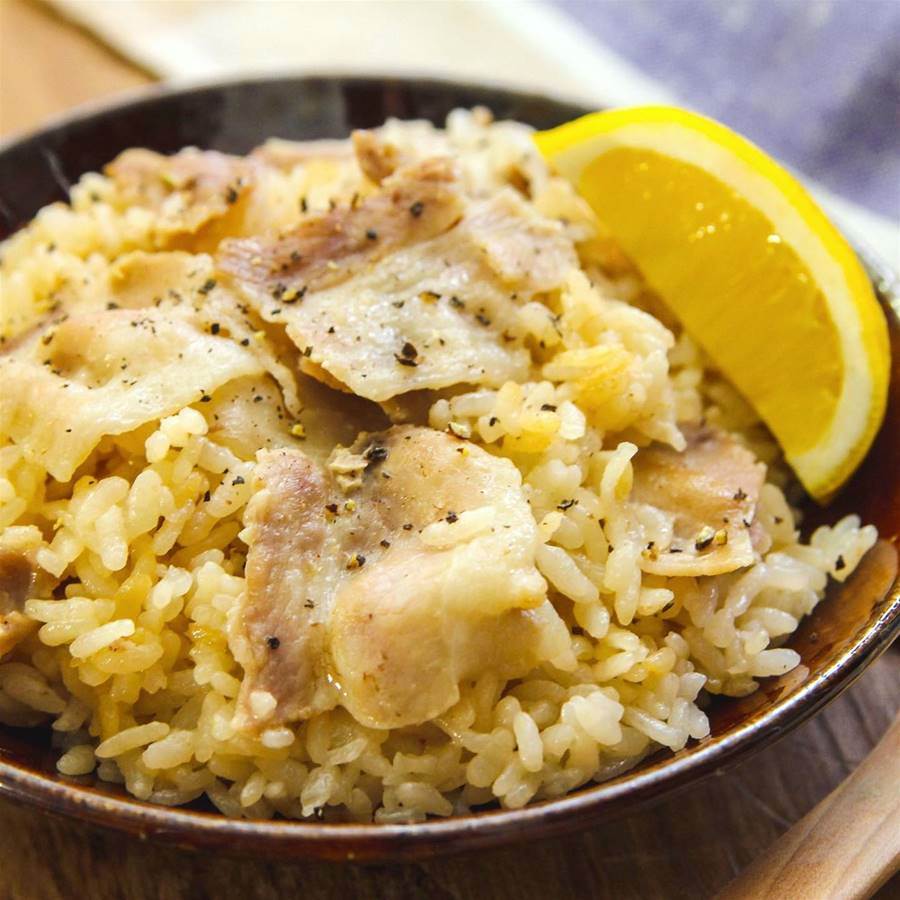 米:1合 水:190ml A調味料 麺つゆ(3倍濃縮):大さじ1 鶏ガラスープの素:小さじ1 おろしニンニク:小さじ1 豚バラ肉(薄切り):100g 塩・黒胡椒:適量 レモン(仕上げ用):適量
