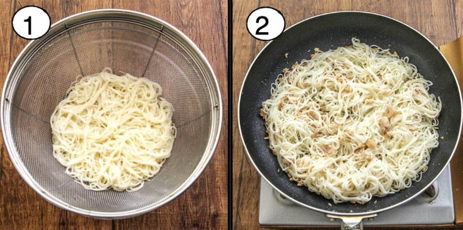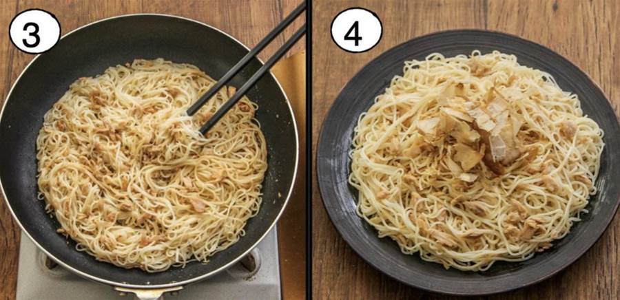 素麺を加えて味付け 素麺をフライパンに加え、全体にツナの油がなじむように混ぜます。Aの調味料(和風だしの素、鶏ガラの素、醤油、塩・黒胡椒)を加えて味を調えます。