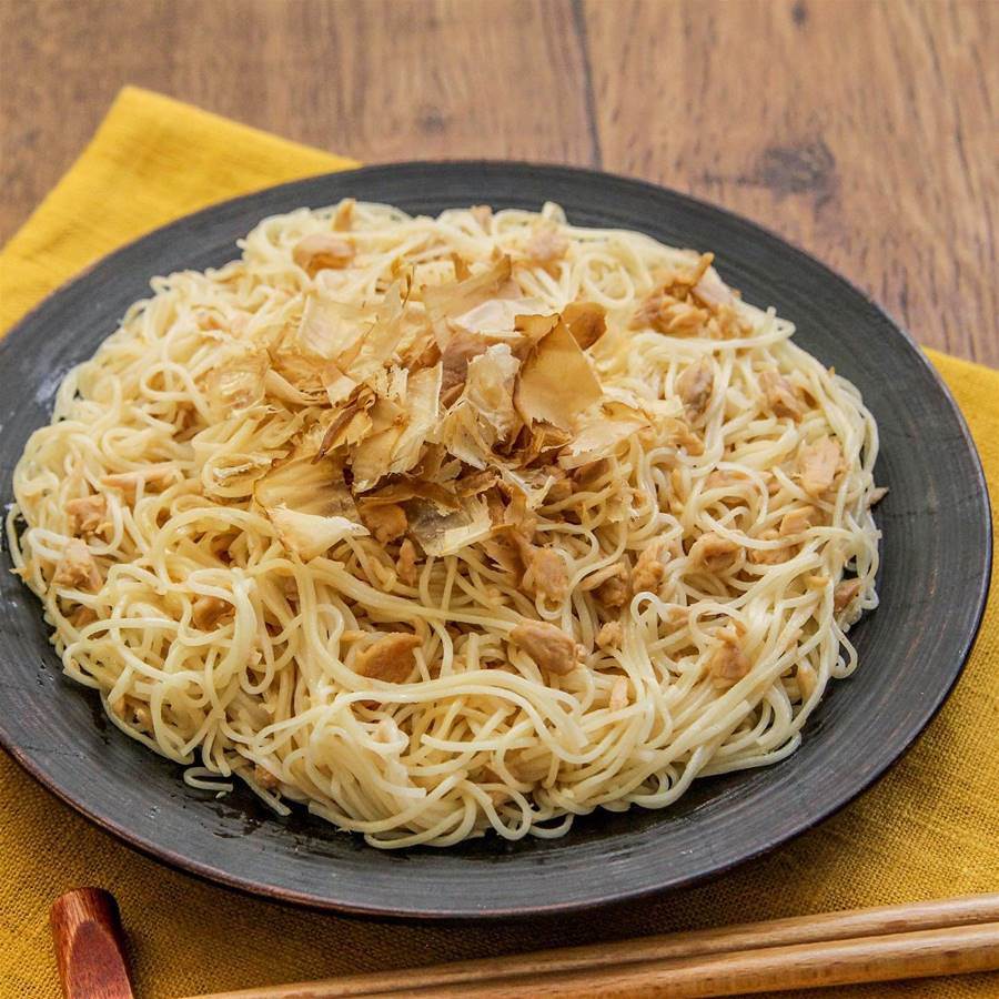 素麺:100g ツナ缶(オイル漬け):1缶(汁ごと使用) ごま油:大さじ1/2 A調味料 和風だしの素:小さじ1/2 鶏ガラスープの素:小さじ1/2 醤油:小さじ1 塩・黒胡椒:適量 かつお節(仕上げ用):適量 七味唐辛子(お好みで):適量