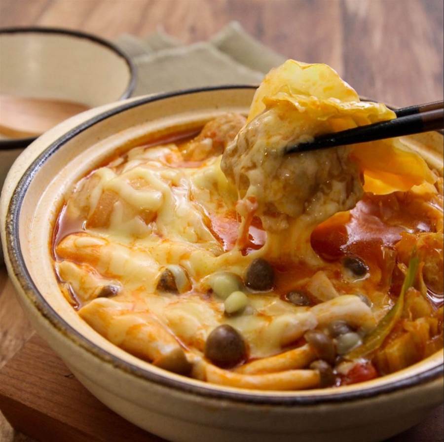 煮込みが終わったら、鍋にピザ用チーズ(50g)をたっぷりと乗せ、フタをしてチーズが溶けるまでさらに1〜2分煮込みます。チーズが完全に溶けて、トロトロになったら完成です!