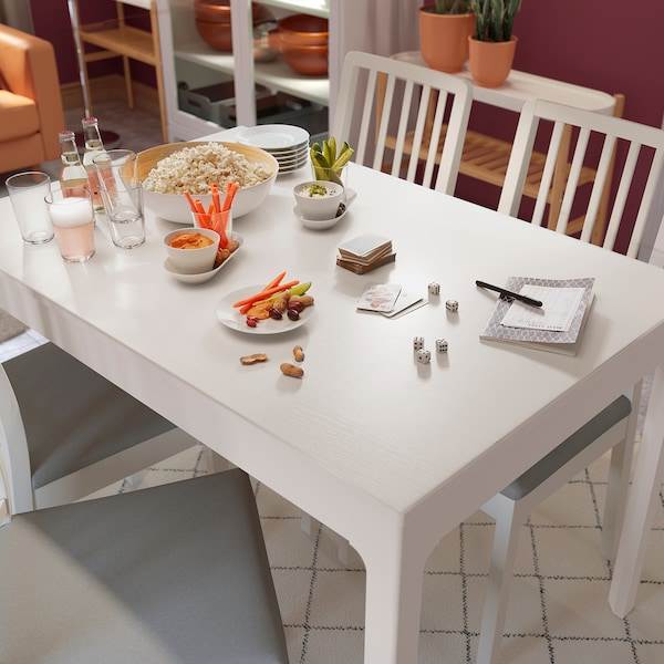 最初にご紹介するのは、イケアの**伸長式テーブル「ダーレン」**です。このテーブルの特徴は、必要に応じてサイズを調整できること。天板の中に収納されたエクステンション部分を引き出すだけで、簡単に広げられます。特に来客が多い家庭や、コンパクトな部屋で使いたい方にぴったりのアイテムです。