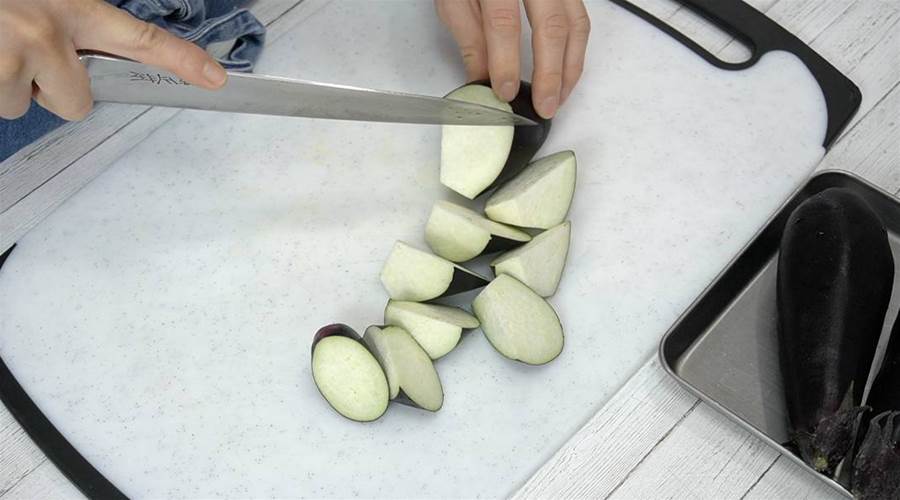 ナスを切る:ナスは洗ってヘタを取り、乱切りにします。乱切りにすることで、味がしっかりと染み込みます。
