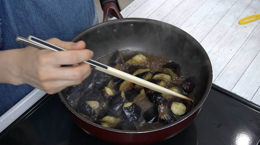 ナスがしっかりと焼けたら、調味料を加えて2分ほど煮詰めます。