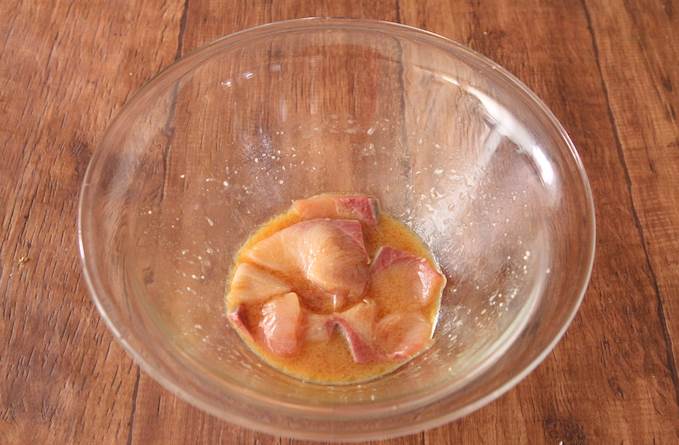 次に、刺身用ブリ(200g)を食べやすい大きさに切り、だれに漬け込みます。漬け時間は1~2分で、ブリがだれを吸って、旨味がしっかりと絡みます。あまり長時間漬けすぎないように注意してください。