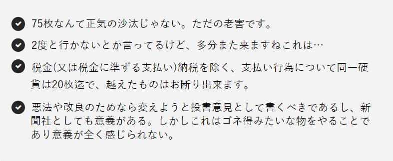 老人の主張には一理あるものの、やはり多くの意見が飛び交う結果となった。特に、75枚もの1円玉での支払いが妥当かどうかという点で、世論は真っ二つに分かれた。