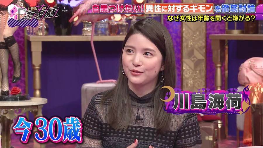 この日の放送では「白黒つけたい男女のギモン」をテーマに出演者らがトーク。年齢の話題になり、川島はMCのくりぃむしちゅー上田晋也から「年齢訊かれたりする?」と話を振られ、「そうですね、やっぱり仕事柄、訊かれるし、私は今30歳なんですけど若く見られる事が多くて」とコメント。上田も意外な年齢に「ちょっとびっくりした」と反応した。