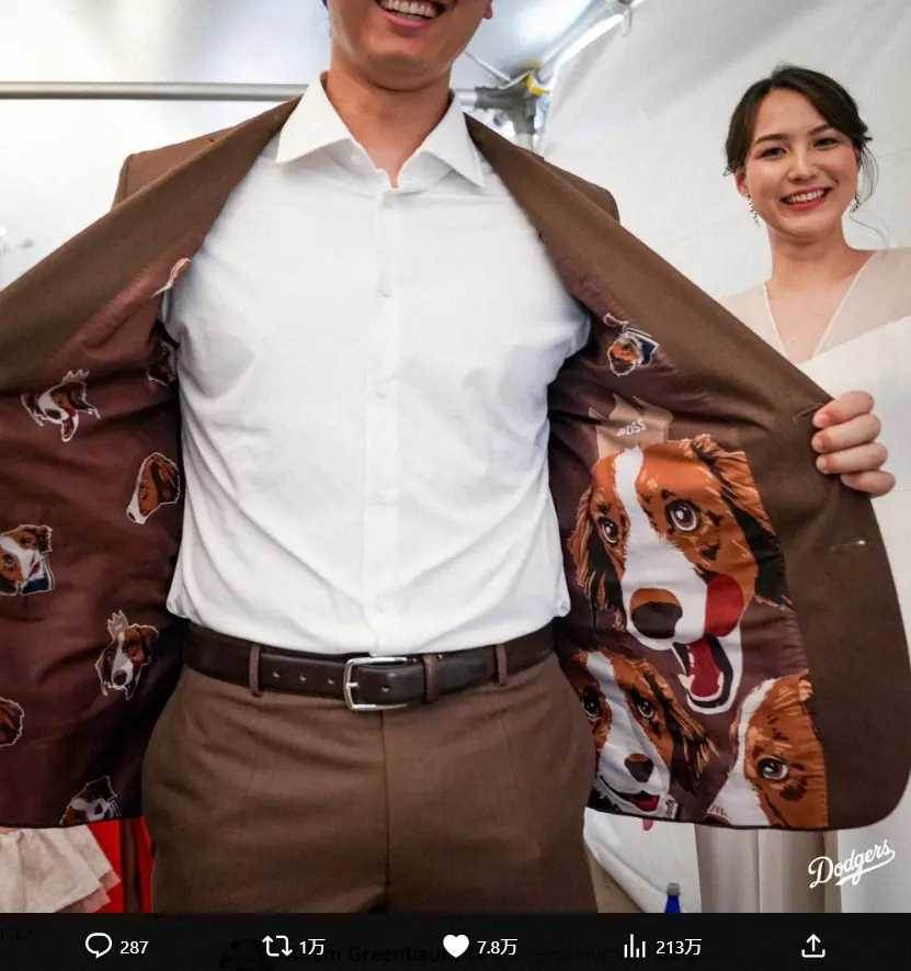 大谷選手がインタビューを受けている間、真美子夫人は少し下がって笑顔で見守っていました。愛犬のデコピンが登場することも示唆していましたが、猛暑のため姿を見せませんでした。しかし、大谷選手がスーツの内側を見せると、そこには多くのデコピンがプリントされており、ファンを驚かせました。