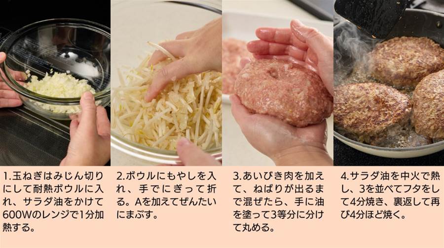 このハンバーグがジューシーになる秘密は、もやしを加えることで水分が保持されることにあります。