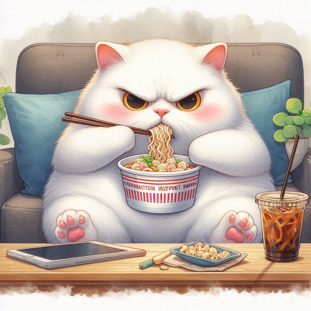 ある日のこと、シャーロックはリビングでインスタントラーメンを食べていた。彼の前には大きなボウルとアイスコーヒーが置かれている。彼の顔にはいつものように怒りの表情が浮かんでいたが、それは単にラーメンが少し熱すぎたからだ。「こんなに熱いラーメン、どうやって食べろというんだ」とシャーロックは心の中で呟いた。しかし、彼は負けなかった。しっかりと箸を握り、少しずつラーメンをすすり始めた。
