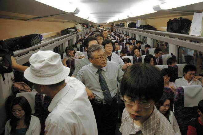 新幹線が発車して数分後、車内は思った以上に混雑していました。指定席を持っていない乗客が何人も乗り込んできており、席を探し回っている様子でした。