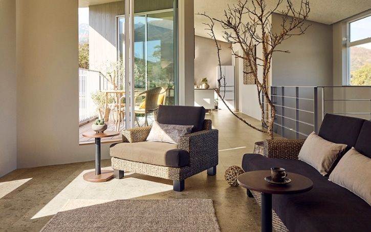 外観の第一印象は「ナチュラルで落ち着いた雰囲気」。外壁には、スペイン発祥の漆喰「エスタコボール」が使用されています。この素材の特徴は、自然な質感と空気を含む柔らかさ。場所によって焼き具合が異なるため、唯一無二の表情が生まれています。